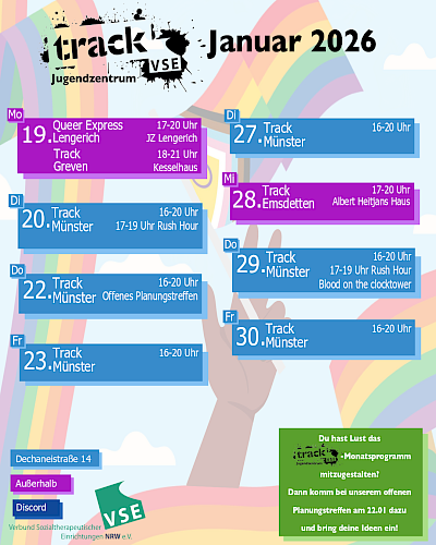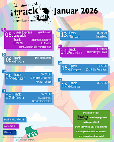 Das Track ist ein LSBTI*-Jugendtreff für Jugendliche und junge Erwachsene bis 27 Jahre. LSBTI* steht dabei für Lesbisch, Schwul, Bisexuell, Trans* und Intergeschlechtlich. Das * (Sternchen) symbolisiert, dass es noch viele weitere Sexualitäten (wie z.B. pansexuell oder asexuell) und Geschlechtsidentitäten (wie z.B. genderqueer oder agender) gibt, die bei uns alle willkommen sind. Willkommen sind bei uns aber auch alle anderen hetero, cisgender Jugendlichen!