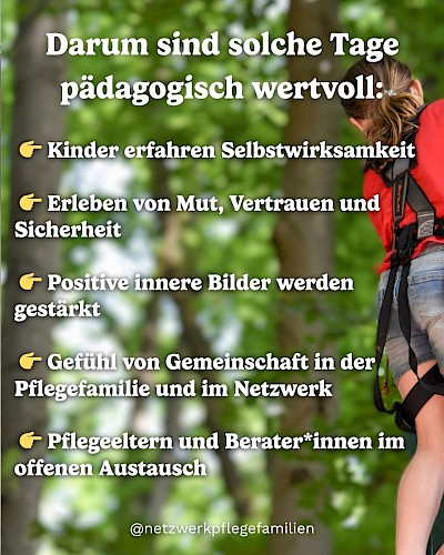 Was auf den Seilparcours sichtbar wird, hat auch im Alltag von Pflegekindern eine große Bedeutung: Vertrauen entwickeln, Herausforderungen annehmen, sich sicher fühlen und unterstützt wissen. Genau das konnten die Kinder hier unmittelbar erleben.