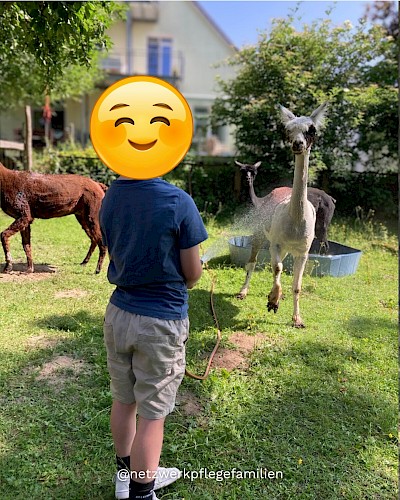 Bei schönstem Hochsommerwetter haben wir einen fröhlichen Nachmittag in entspannter Atmosphäre verbracht. Das nette Team des Hofes startete mit einigen spannenden Infos (an welchen drei Merkmalen kann man zum Beispiel Lamas von Alpakas prima unterscheiden?). Später gab es aufgrund des sommerlichen Wetters nicht nur die Chance, den Tieren beim Füttern mit Heu und vorsichtigem Streicheln näher zu kommen, sondern auch für eine angenehme Abkühlung beim Wasserspaß zu sorgen.